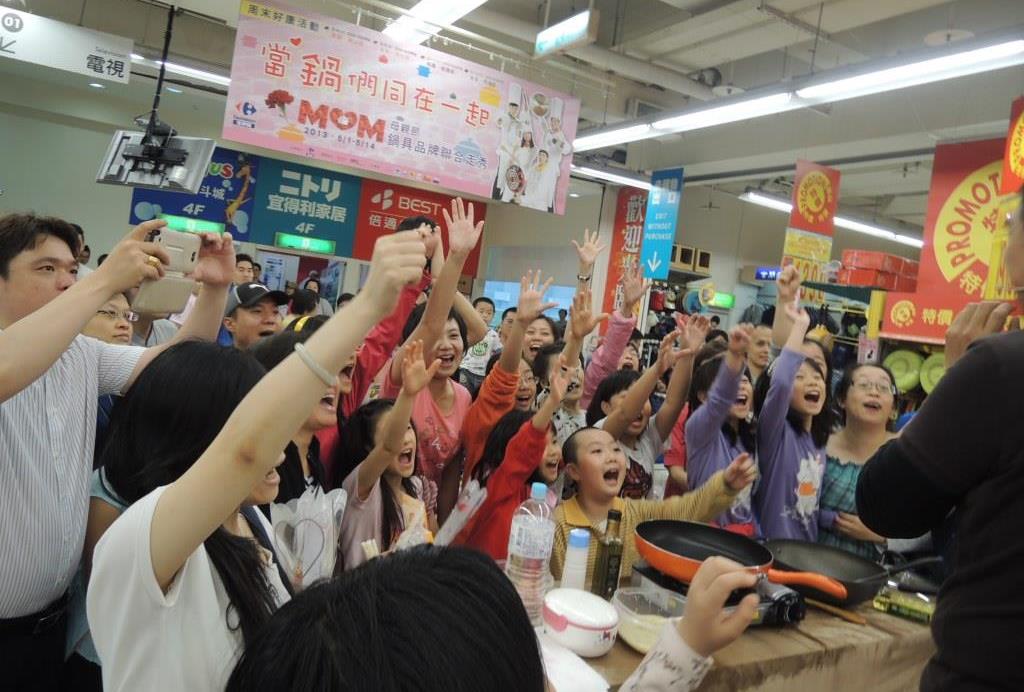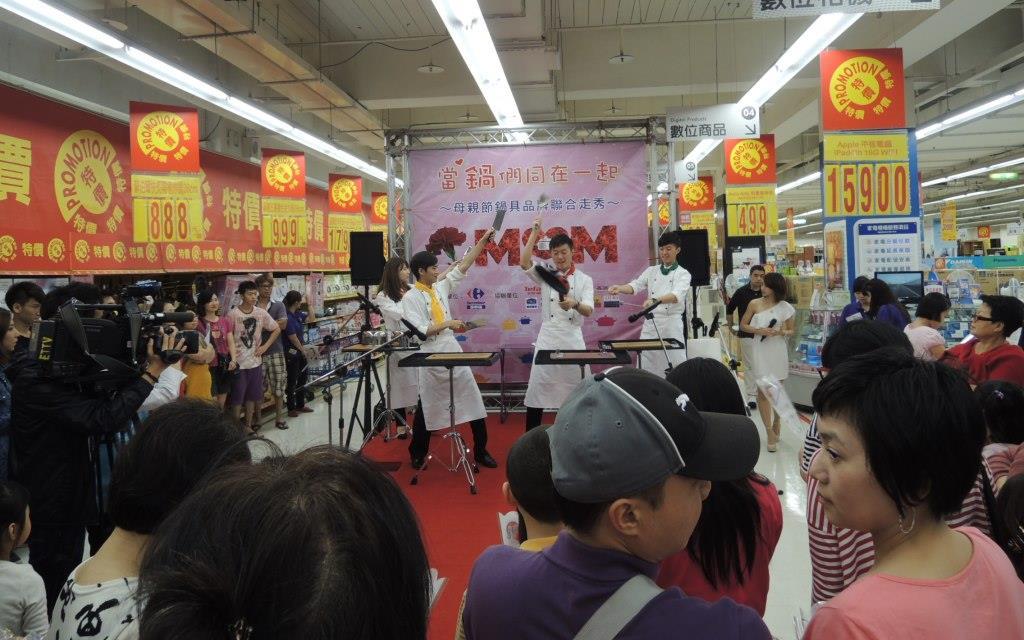 有別於量販店傳統被動式推銷展售模式,「珮庭整合傳播顧問」規劃於母親節前2週之周末假日,分別在「家樂福」北、中、南4家分店賣場內舉辦品牌鍋具聯合展售活動,透過時尚走秀與主廚上菜秀等高品質展演方式,提升傳統賣場內之活動質感層次,藉此擴大品牌鍋具的消費市場與知名度。為呈現最完美的演出,與表演團體溝通走位流程並細部調整模特兒展演方式。,開場秀由專業打擊樂團Punch在精心設計的舞台上巧妙融入鍋具完成精采演出,讓所有人彷彿進入音樂殿堂一般享受,型男模特兒也配合各品牌鍋具特色走秀展演,使會場增添時尚氛圍,讓進入賣場消費者有驚喜的消費體驗,並憑藉主廚上菜秀展現鍋具特性,搭配定時優惠贈品發送與有獎徵答活動,成功吸引並增加消費連結,加深品牌特色印象,進而提升賣場形象及實收績效。