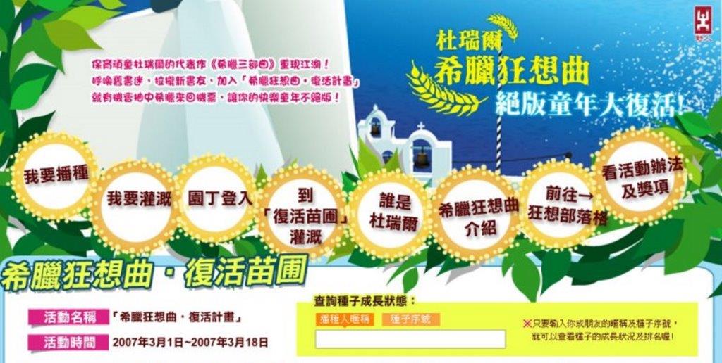 「野人出版社」為了延續經典好書的流傳,將英國作家杜瑞爾的經典絕版代表作《希臘三部曲》,重新命名為《杜瑞爾‧希臘狂想曲》全新改版再發,透過多面向網路行銷宣傳與推薦活動,引起廣大消費者熱烈迴響,成為野人出版社2007年暢銷作品之一。