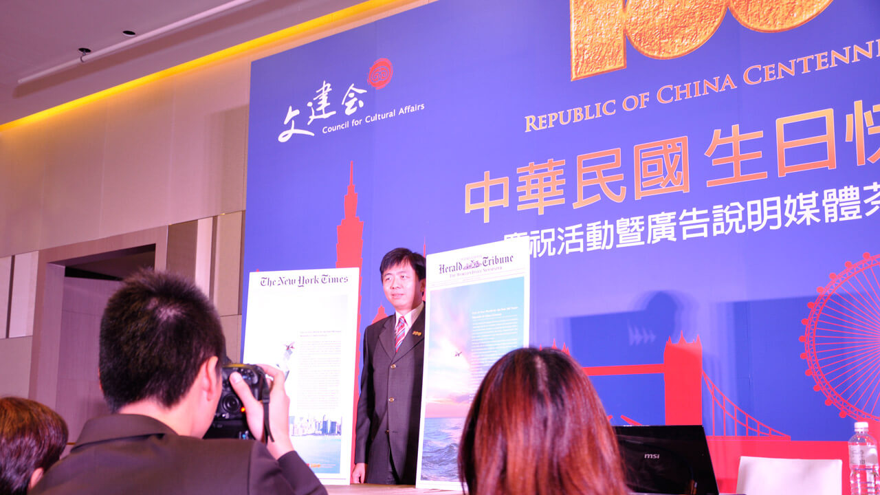 為即將到來的雙十節國慶晚會、11/12「聽見未來 夢想一百」演唱會,以及年底12/31「轉動臺灣向前行」等慶祝活動,還有中華民國建國百年的國際宣傳計畫暖身,「珮庭整合傳播顧問」邀請國內及國際駐臺記者一同參與媒體茶敘活動。以溫馨精緻的會場氣氛,由中、英文流利之專業司儀引導活動流程,透過縮小的實景演繹,於媒體茶敘活動中公布即將於「The New York Times (紐約時報)」與「 International Herald Tribune (海外版紐約時報)及紐約時代廣場LED螢幕上播放廣告與國際宣傳行動。與媒體能更深入溝通,藉著國、內外媒體將中華民國建國百年及相關慶祝活動訊息傳達出去,邀請國內同胞及國際友人一起參與。